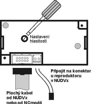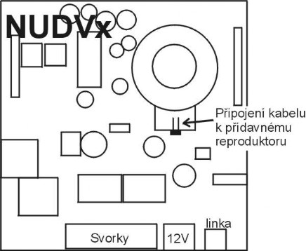Přídavný reproduktor je další modul ve stavebnici NUDV vrátného. Použití nalezne v hlučném prostředí, tam kde základní hlasitost již nevyhovuje. Tento modul obsahuje zesilovač napájený pomocí plochého kabelu ze základního modulu. Proto je podmínkou mít na základní modul připojený napáječ. Zdroj signálu se získá připojením dvou vodičů paralelně na reproduktor v základním modulu (konektor) - je umístěn pod odnímatelnou deskou CPU. Polaritou tohoto připojení je možno eliminovat případnou akustickou vazbu. Nastavení požadované hlasitosti je možno šroubovákem v naznačeném otvoru.