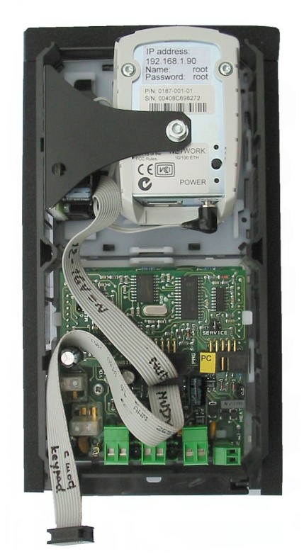 Kamera je v modulu vrátného připevněna pomocí šroubu M4 k držáku, který umožňuje v úhlu do 5 st. nastavit směr kamery - přihnutím držáku. Dále je modul vybaven napájecím obvodem, který využívá napáječ pro spínače (připojení na svorku "12V" na základním modulu NUDVx a pomocí plochého kabelu vedoucího k rozšiřujícím modulům tlačítek napájí vlastní kameru.