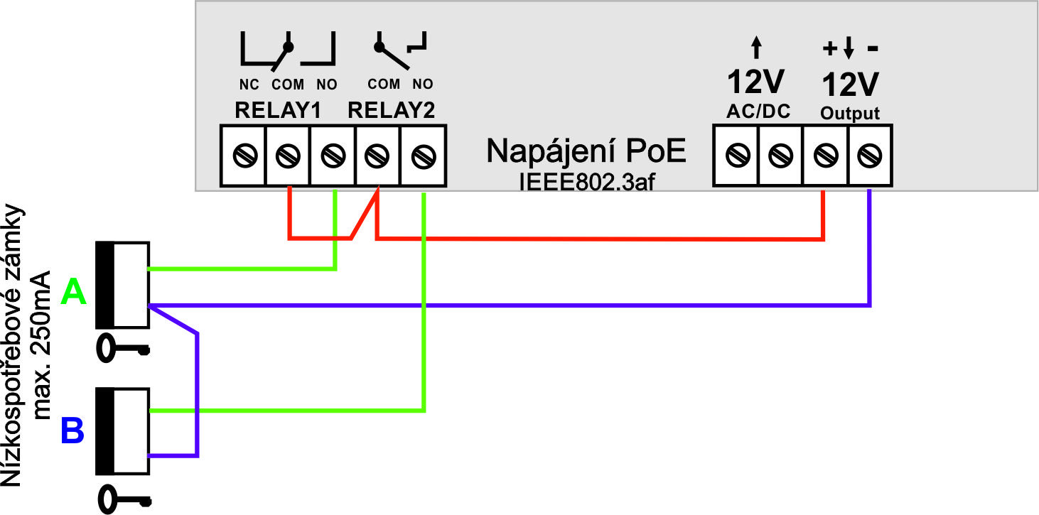 Zde je obrázek jak jednoduše připojit elektrický zámek napájený PoE