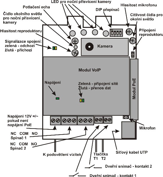 Slim IPDP základní modul se skládá z desky vrátného a desky VoIP modulu, připojení konektorů a nastavovací prvky jsou na obrázku.