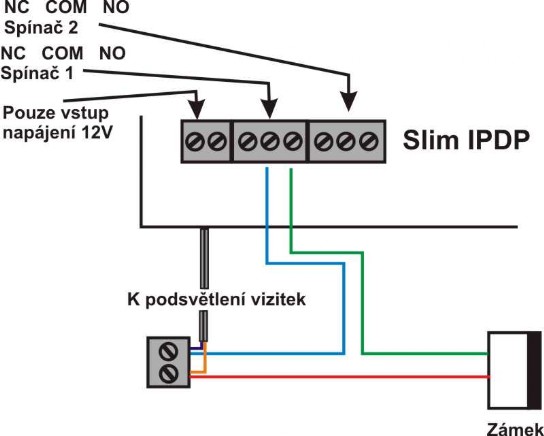 Pro Slim IPDP je doporučeno použít napájení pomocí PoE technologie nebo střídavé napětí min.11Vst - max.15Vst nebo stejnosměrné napětí min.12Vss - max.18Vss. které se připojí na svorku "12V". Odběr IPDP je max.300mA. Tento zdroj lze použít zároveň pro napájení zámku(ů), pak je třeba počítat ještě s odběrem elektrického zámku. V většinou vyhoví střídavý / stejnosměrný napáječ 12V/1A ÷ 2A.