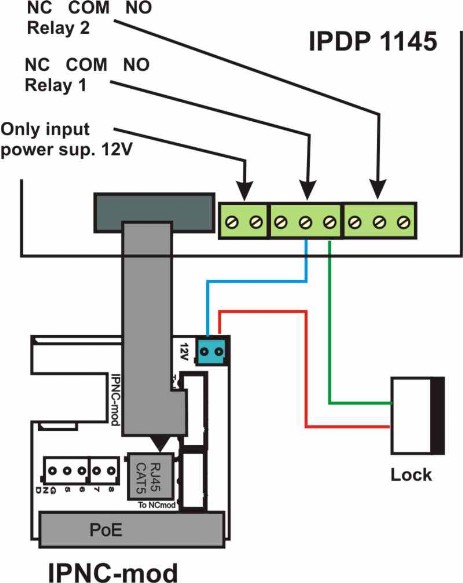 Vrátný IPDP je vybaven obvodem pro napájení po UTP kabelu – PoE. Pokud máte síťový switch vybaven napájením PoE, nebo vlastníte napáječ PoE (krabička velikosti síťového adaptéru vložená do přívodu UTP kabelu - IEEE802.3af) tak již pro funkci vrátného nepotřebujete napájení 12V. Pokud používáte elektrický zámek pro otevření dveří, tak musíte pro napájení zámku použít napájecí zdroj (pouze v obvodu s kontakty relé), nebo použít nízkoodběrový zámek a pak pro napájení zámku požít svorku na IPNCmod 12V a při napájení PoE je zde 12V/350mA k dipozici.