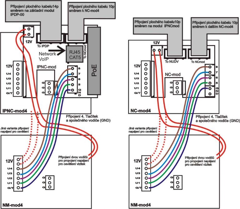 Modul IPNCx-mod obsahuje elektroniku, modul PoE a připojení UTP kabelu (Ethernet). Dodává se v provedení s 1, 2 a 4 tlačítky. Připojuje se vždy k základnímu modulu IPDP-00 plochým kabelem 14p. Za IPNC4-mod lze zapojit další modul NC-mod4 – plochý kabel 10p. Na modulu jsou dále svorky pro připojení dalších 4čítek a napájení prosvětlení (na následujícím NMmod4)